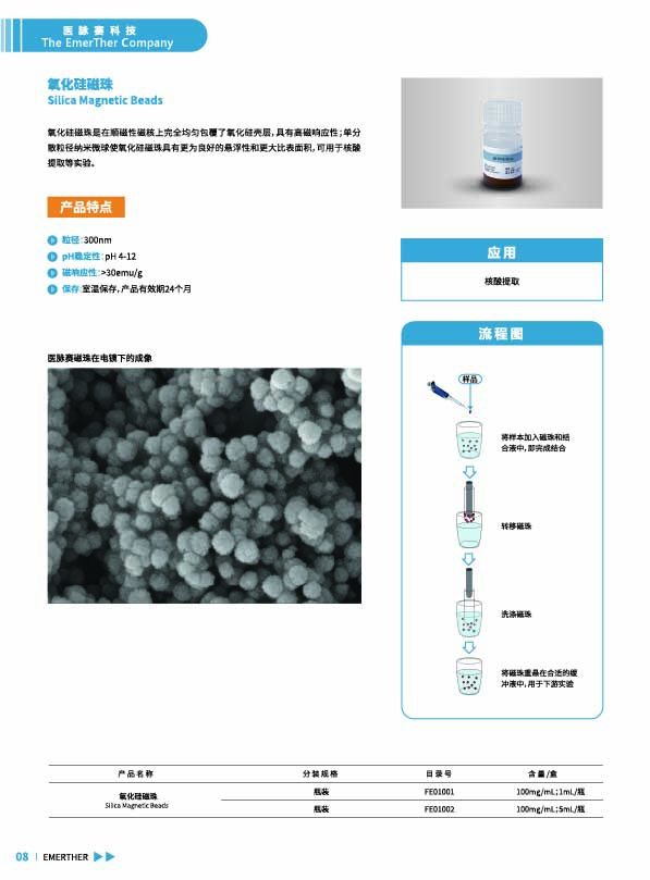 氧化硅磁珠在顺磁性磁核上完全均匀包覆氧化硅壳层,具有高磁响应性;单分散粒径纳米微球使氧化硅磁珠具有更为良好的悬浮性和更大比表面积,可用于核酸提取等过程。