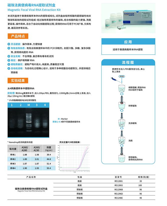 本试剂盒适用于提取粪便样本中RNA。试剂盒由高效吸附核酸的超顺磁性纳米微球和安全环保的提取试剂体系组成:经过独特的表面修饰的磁珠,结合核酸能力更强、洗脱更容易;操作步骤简单,操作时间短,可在室温下完成整个提取过程,适合于快速核酸提取的磁珠自动化过程。