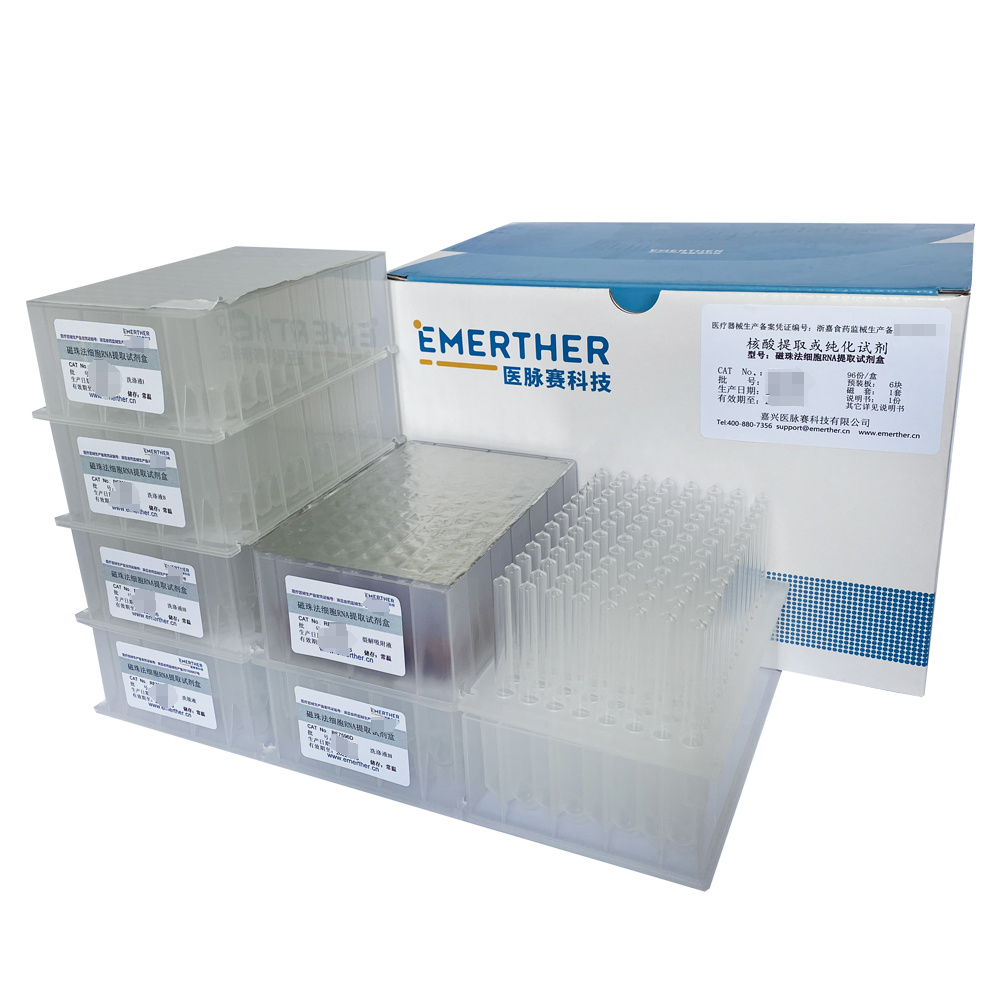 本试剂盒用于血凝块样本基因组DNA提取。试剂盒由高效吸附核酸的超顺磁性纳米微球和安全环保的提取试剂体系组成:经过独特的表面修饰的磁珠,结合核酸能力更强;