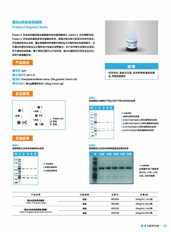 在非变性洗脱条件下,本产品可反复使用。在多次反复使用后可能因杂质吸附导致结合量下降,本产品耐受pH13以下溶液,建议磁珠使用5次及以上、当抗体载量下降后进行碱处理,以去除非共价结合的蛋白,提高磁珠对抗体的吸附量。