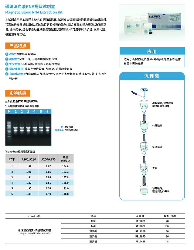 本试剂盒适用于提取血液样本中RNA。试剂盒由高效吸附核酸的超顺磁性纳米微球和安全环保的提取试剂体系组成:经过独特的表面修饰的磁珠,结合核酸能力更强、洗脱更容易;操作步骤简单,操作时间短,可在室温下完成整个提取过程,适合于快速核酸提取的磁珠自动化过程。