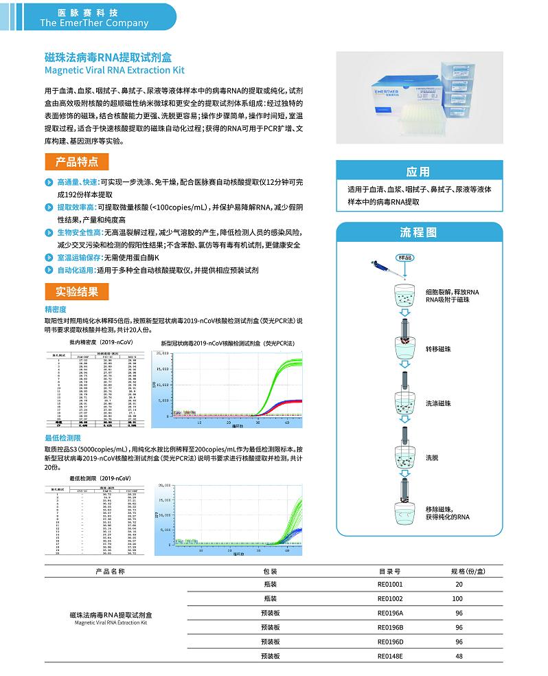 本试剂盒适用于提取咽拭子等液体样本中病毒RNA。试剂盒由高效吸附核酸的超顺磁性纳米微球和安全环保的提取试剂体系组成:经过独特的表面修饰的磁珠,结合核酸能力更强、洗脱更容易;操作步骤简单,操作时间短,可在室温下完成整个提取过程,适合于快速核酸提取的磁珠自动化过程。